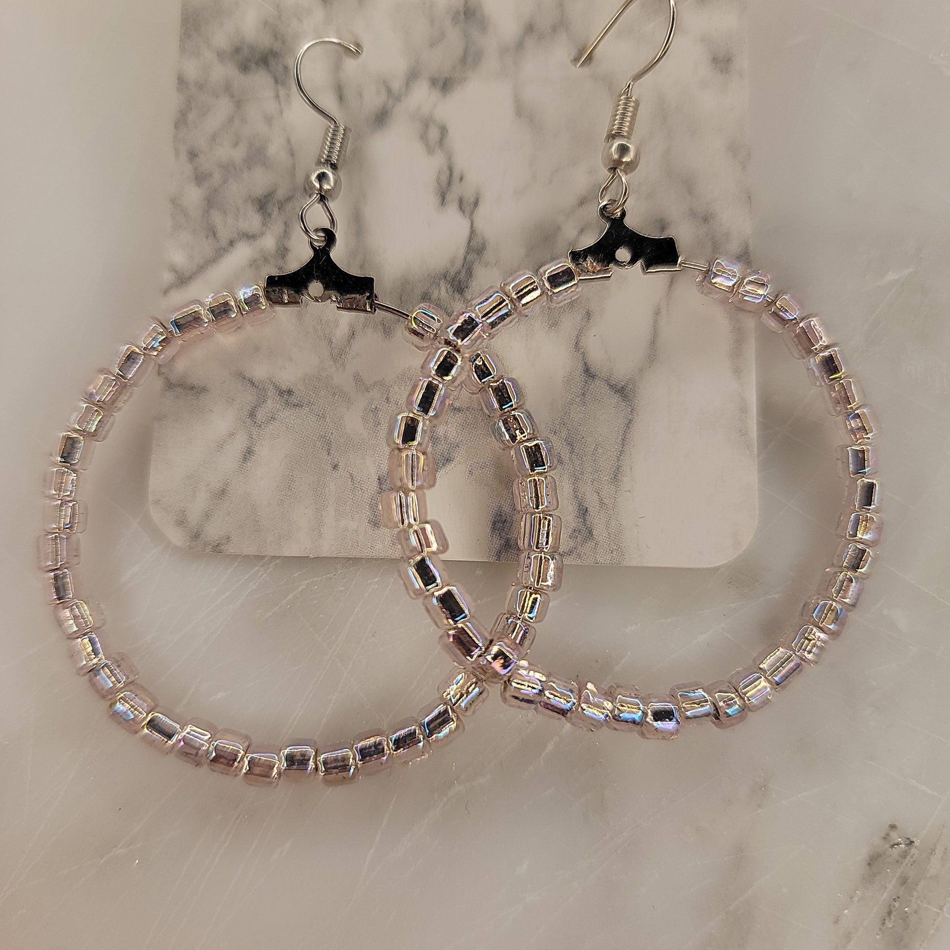 Hoop earrings made from wire hoops and pink seed beads
