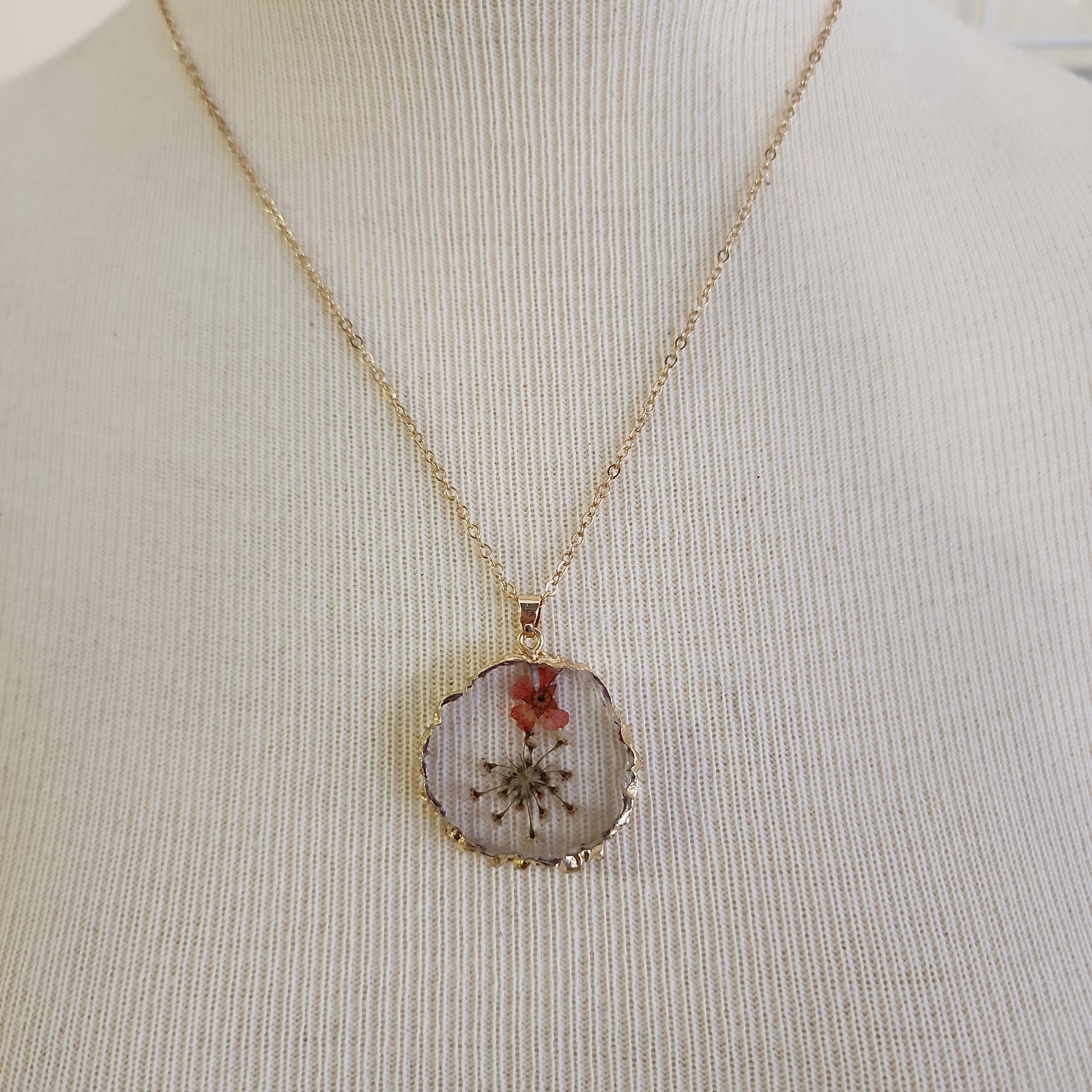 THis necklace has a gold chain with red flower incased in resin. with gold foil around the edge of pendant.